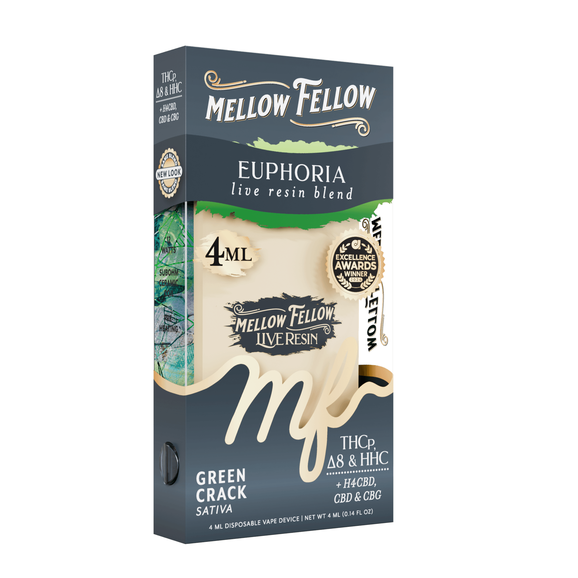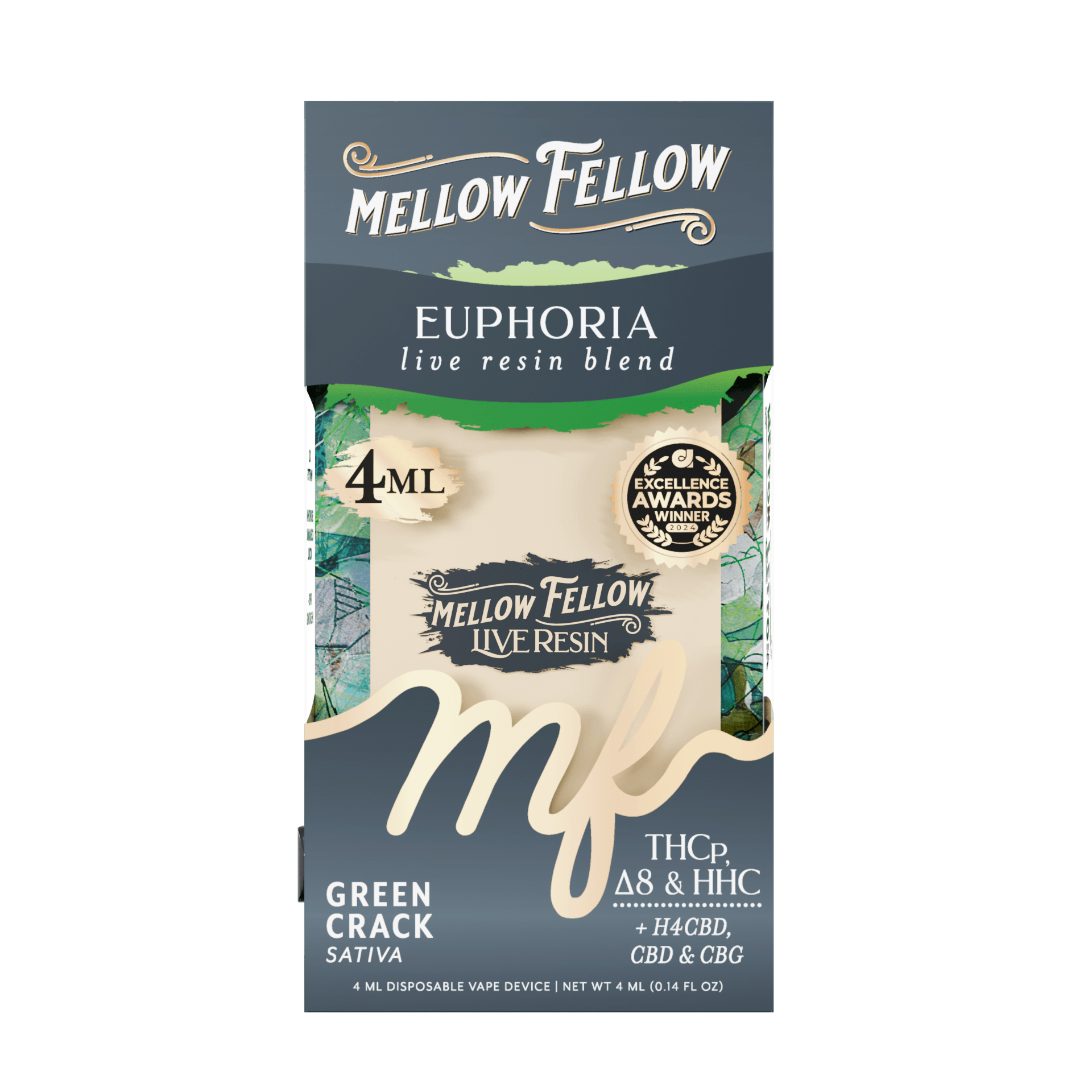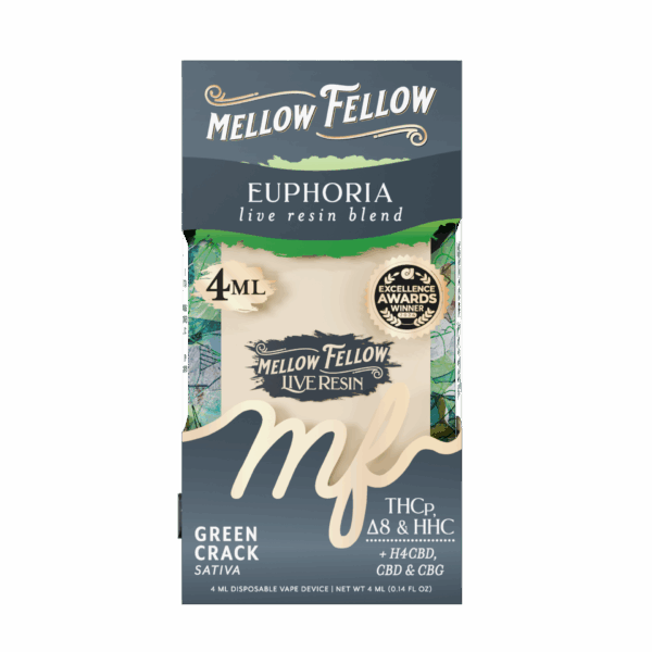 This is the standard, high concentration of THC for Mellow Fellow’s live resin line, ensuring potent psychoactive effects.